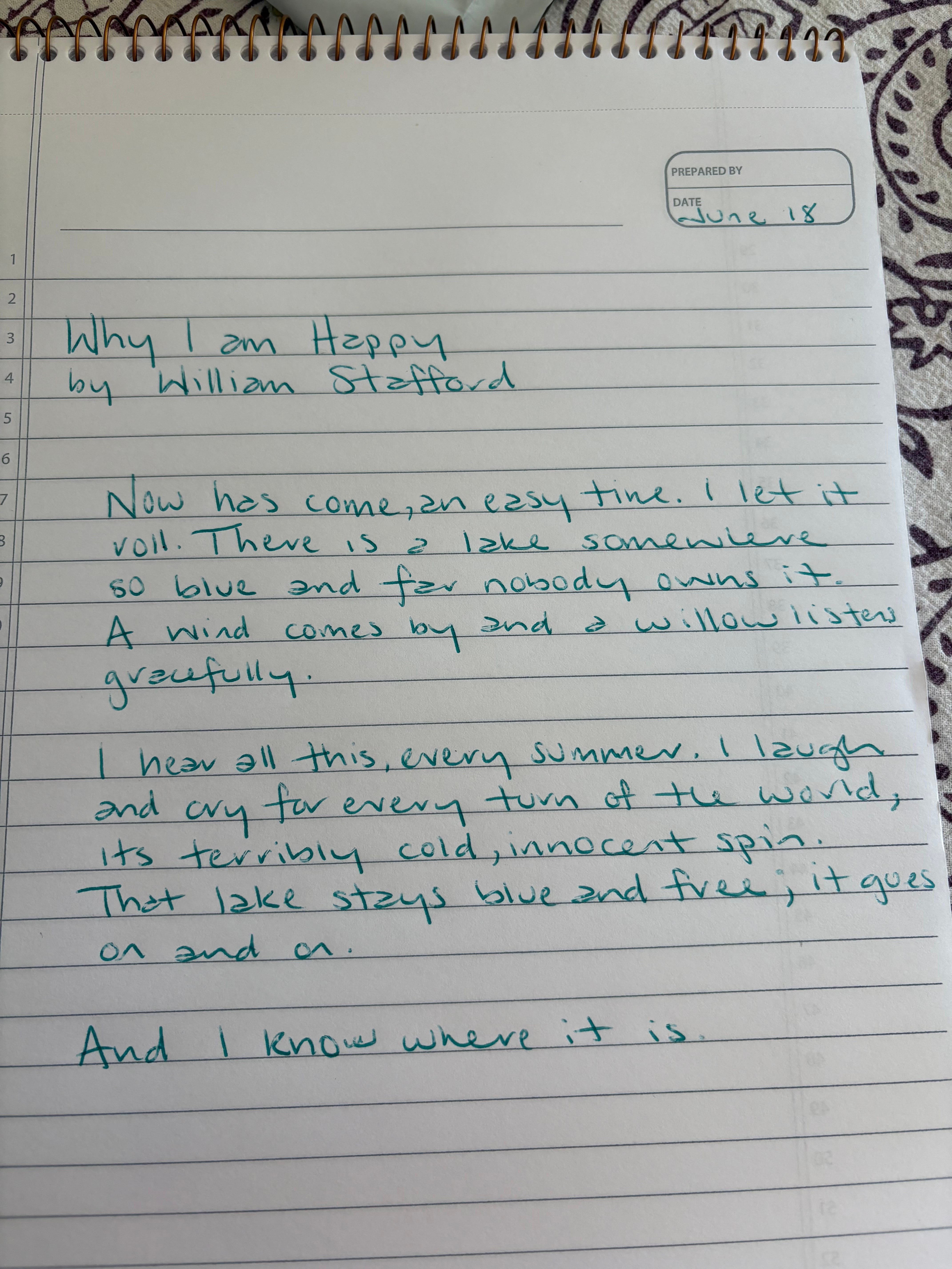 Of course it is time for new notebooks. As is my practice, a poem. I recently treated myself to a book of William Stafford’s poems. His “Why I am Happy” is my poem for now.